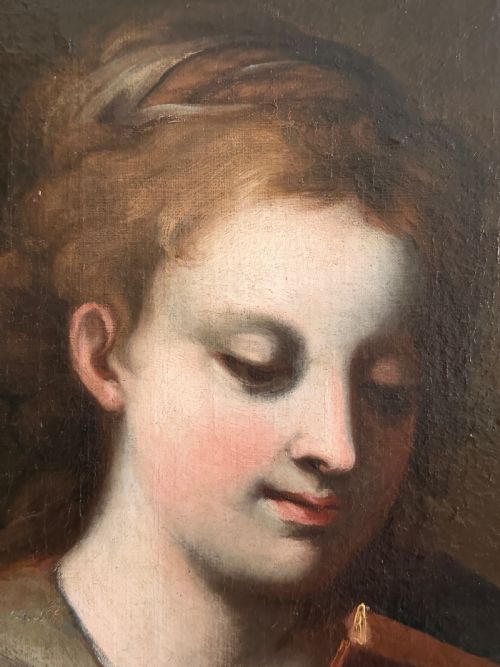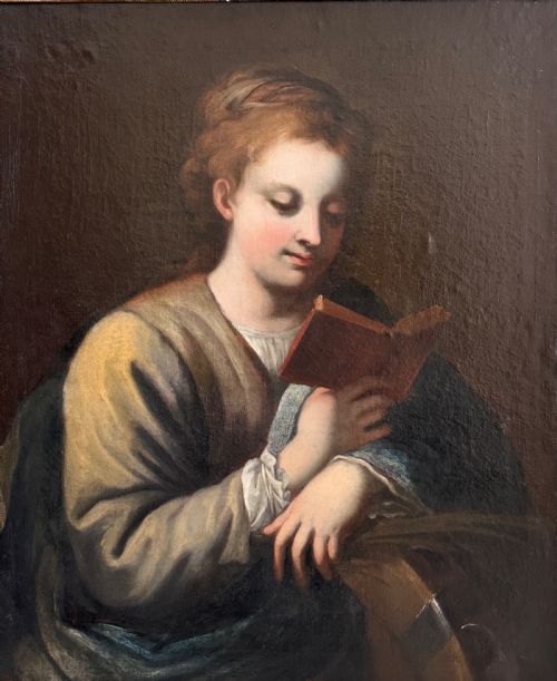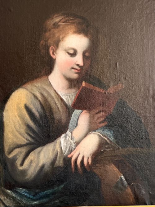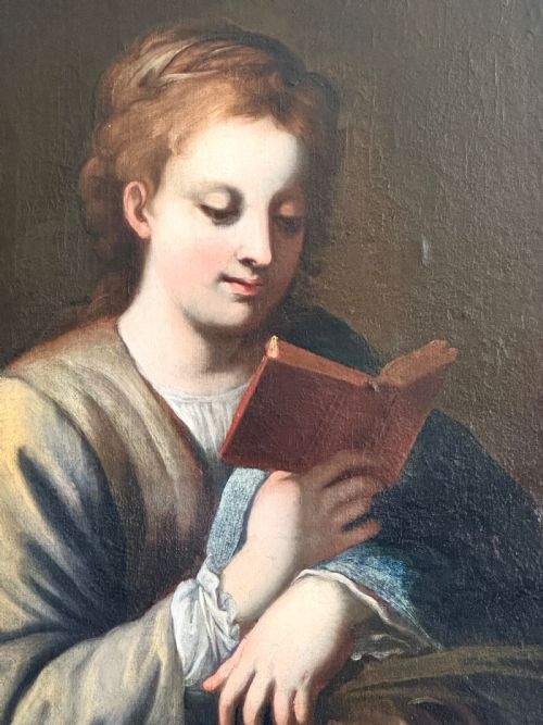A large and impressive Italian late 18th century oil on canvas of St Catherine, reading.