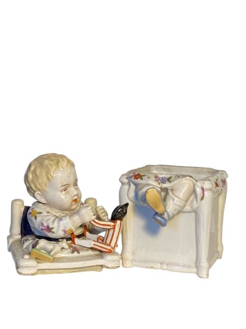A beautifully detailed German porcelain tobacco box in the form of a young child in a high chair playing with toys.