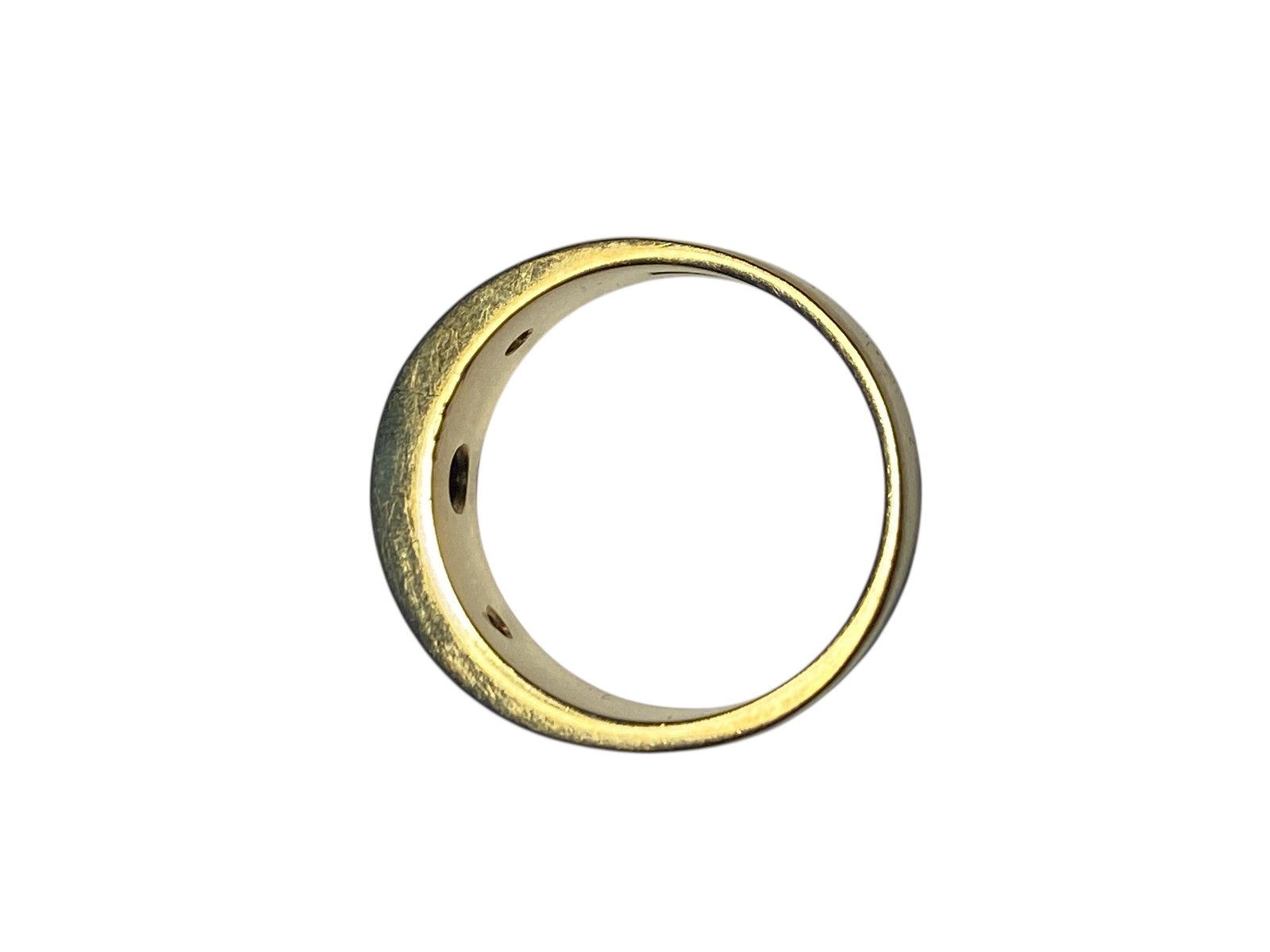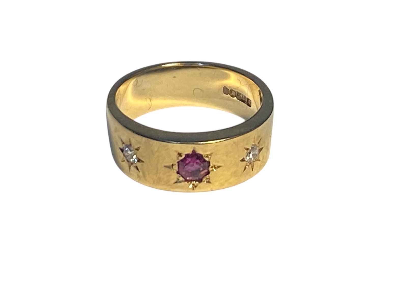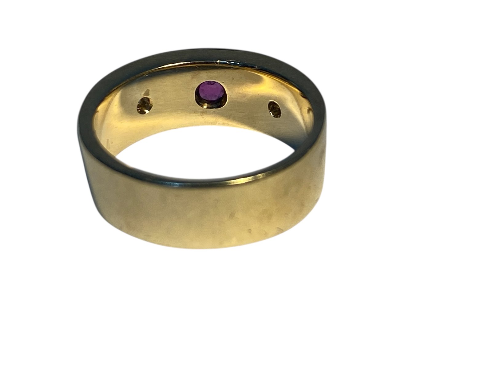 A 9ct Gold Band, Gypsy set, with a single ruby. The ruby is flanked on either side by a round cut diamond.