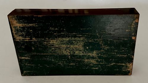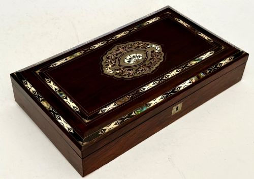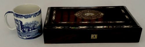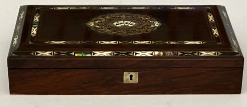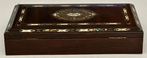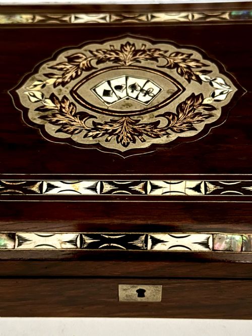 In very good condition.  Decorated with inlaid pewter, abalone and bone to the cushion top.