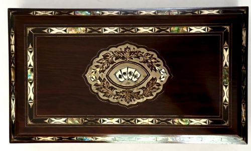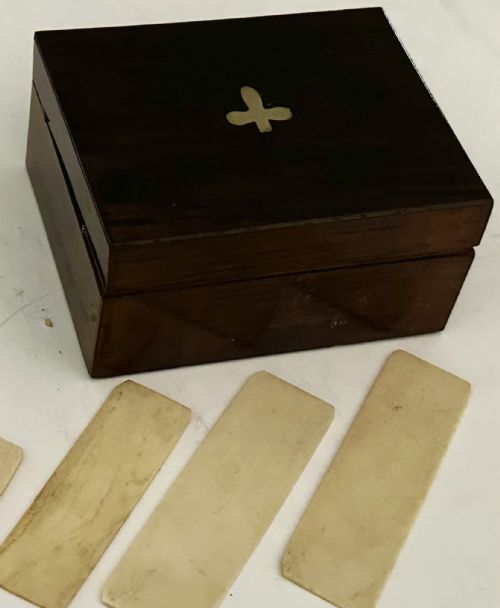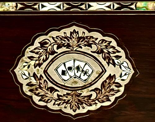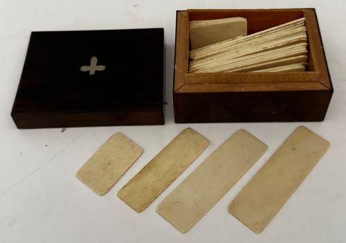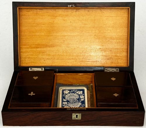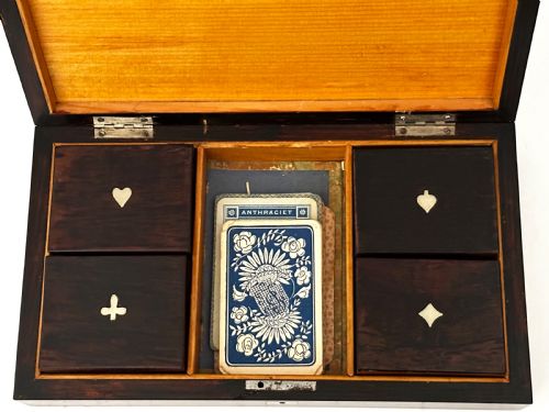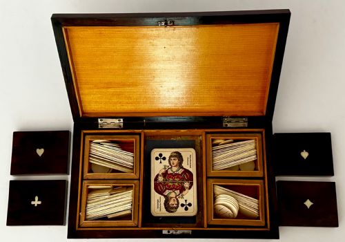 Inside, there are four boxes, each with lids bearing card suits and all full of bone gaming counters.