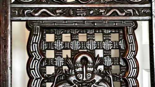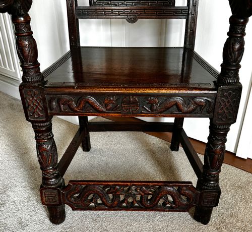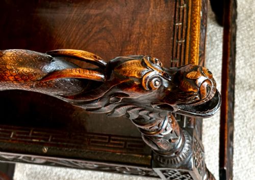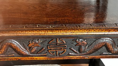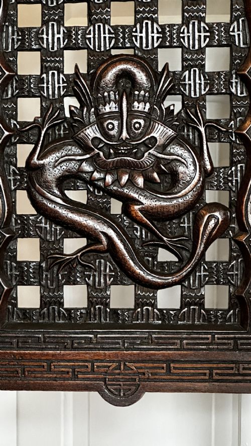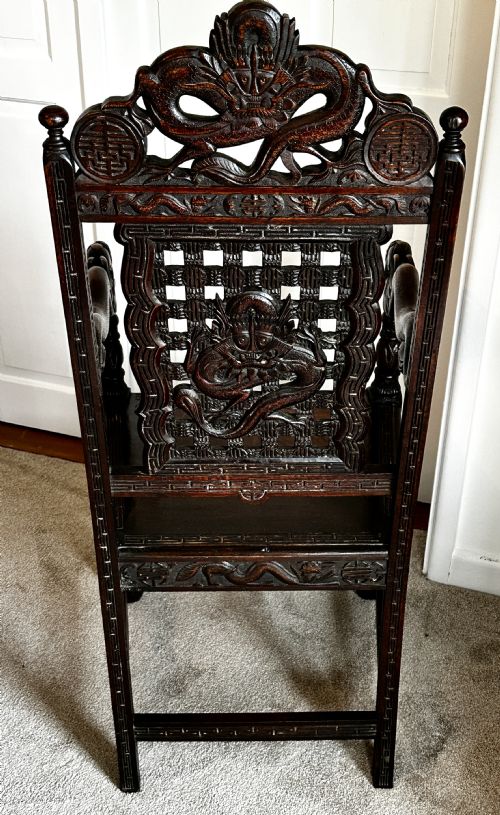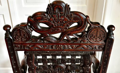 The carvings depict deity, dragons and Chinese script. Interestingly, the back of the chair is as extravagantly carved as the front and looks interesting from every angle.