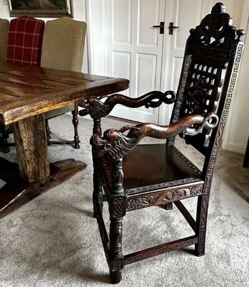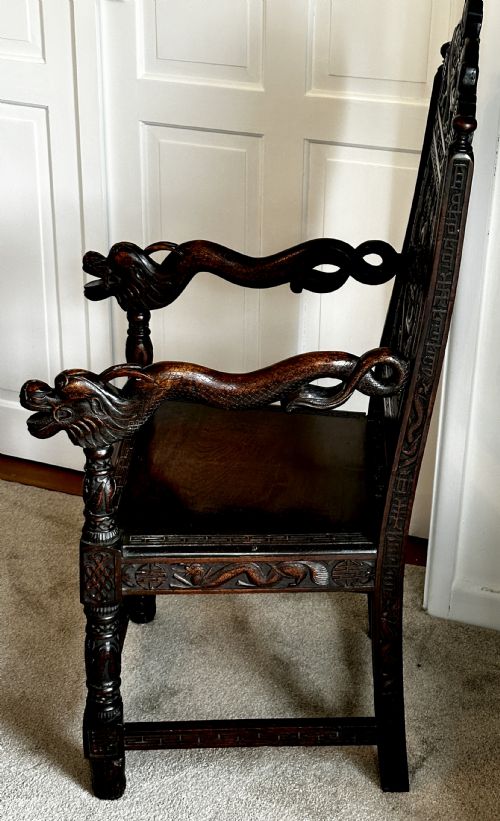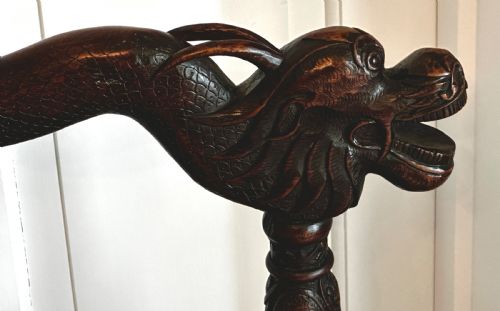 The arms have open mouthed dragons with horns. It is heavy and very substantial with an allover rich patina.