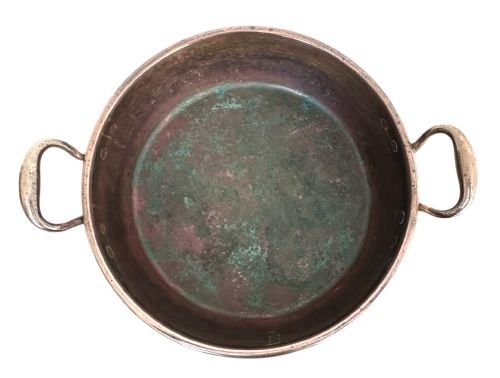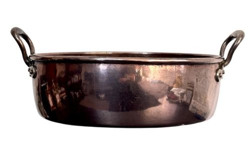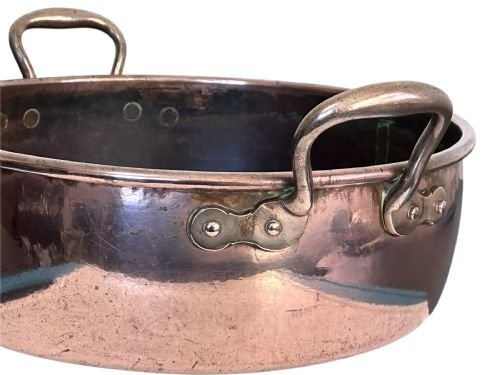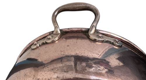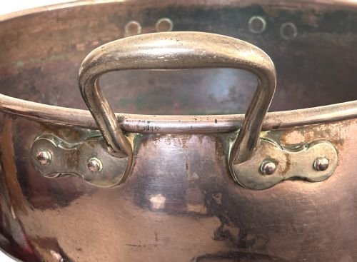 A heavy and substantial late 19th Century copper preserving pan with two brass handles.