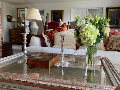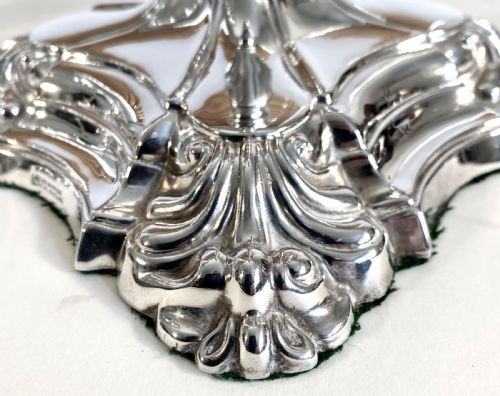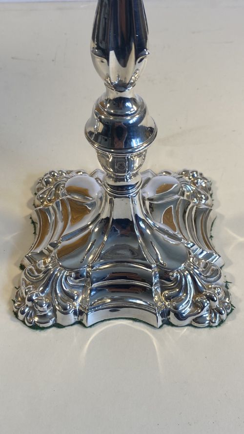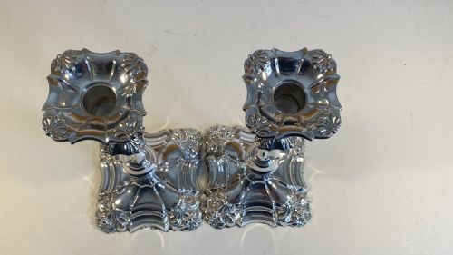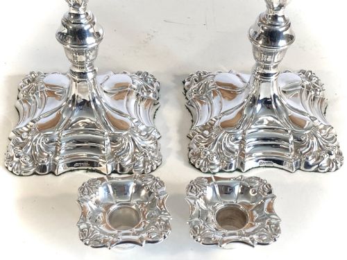 Pair of Edwardian silver on copper candlesticks in the Georgian style with knopped stems and stepped bases. The sconces are removable.