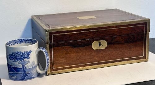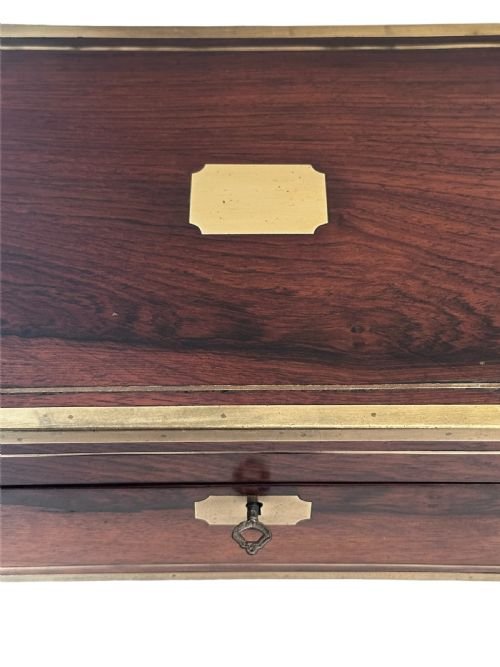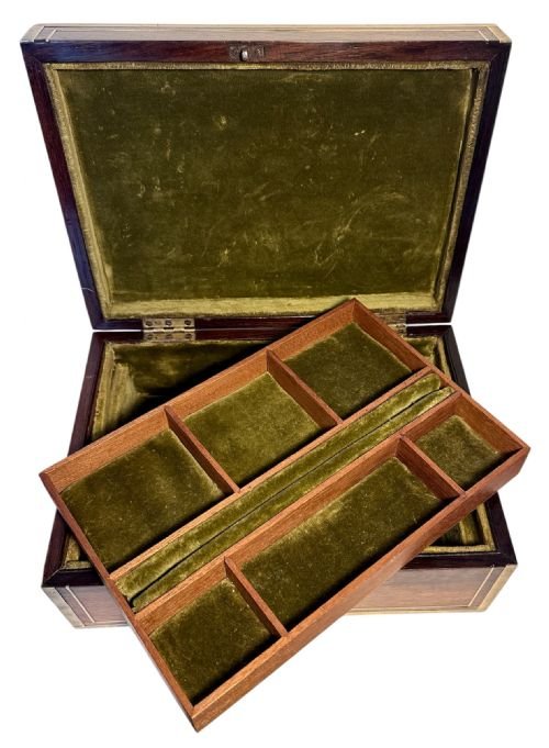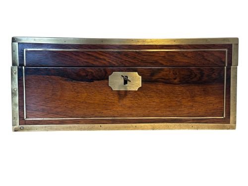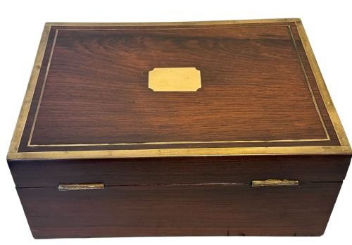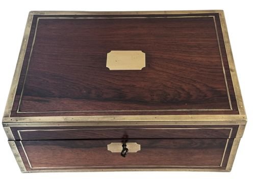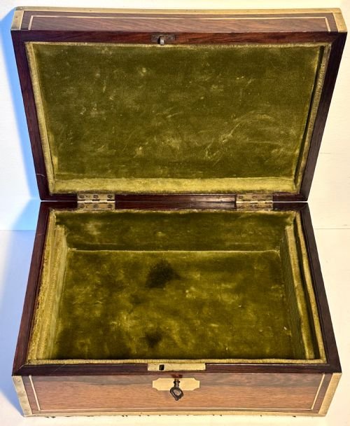 A very lovely and early rosewood jewellery box with brass cross banding, a vacant cartouche and a working key.