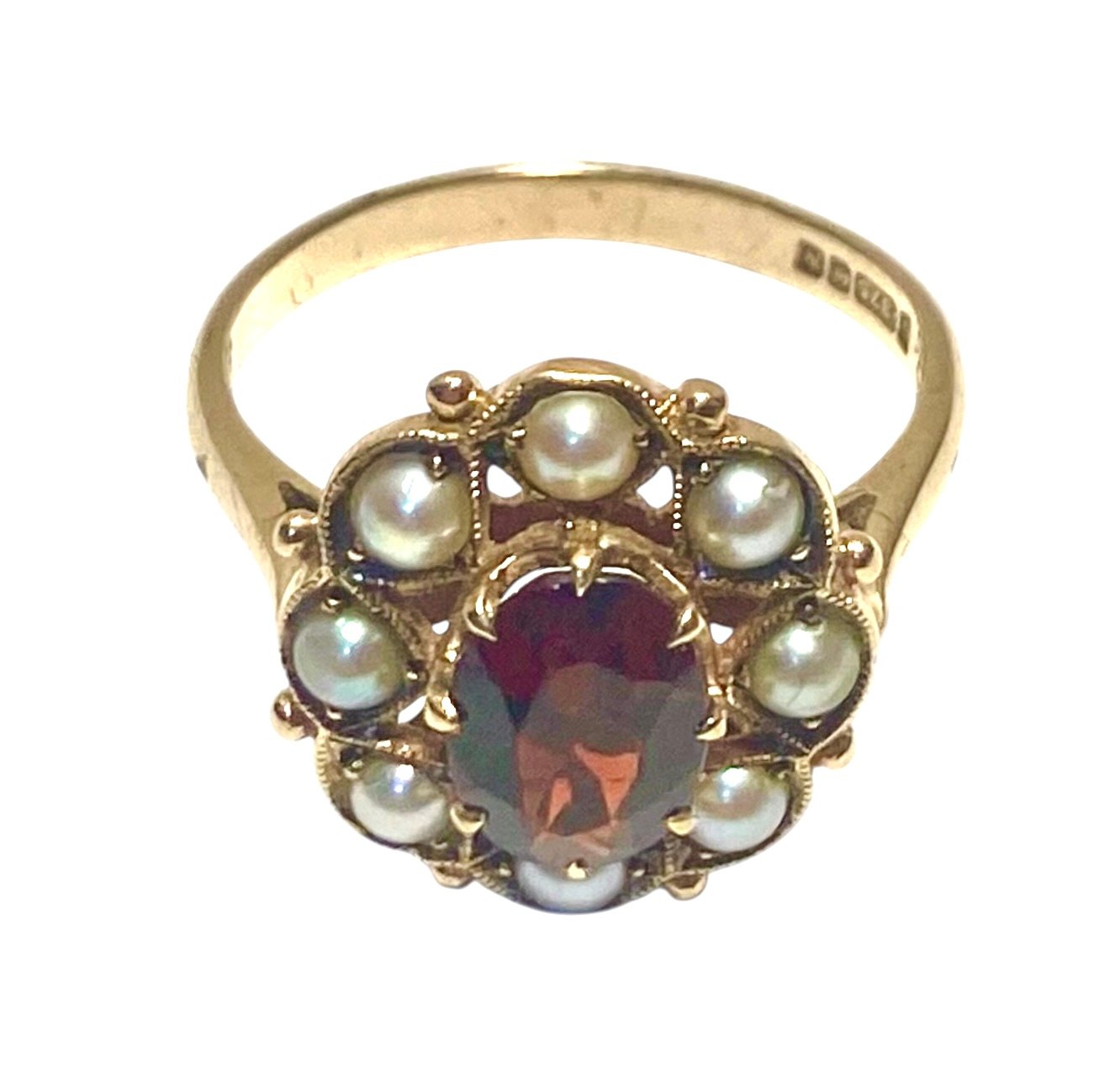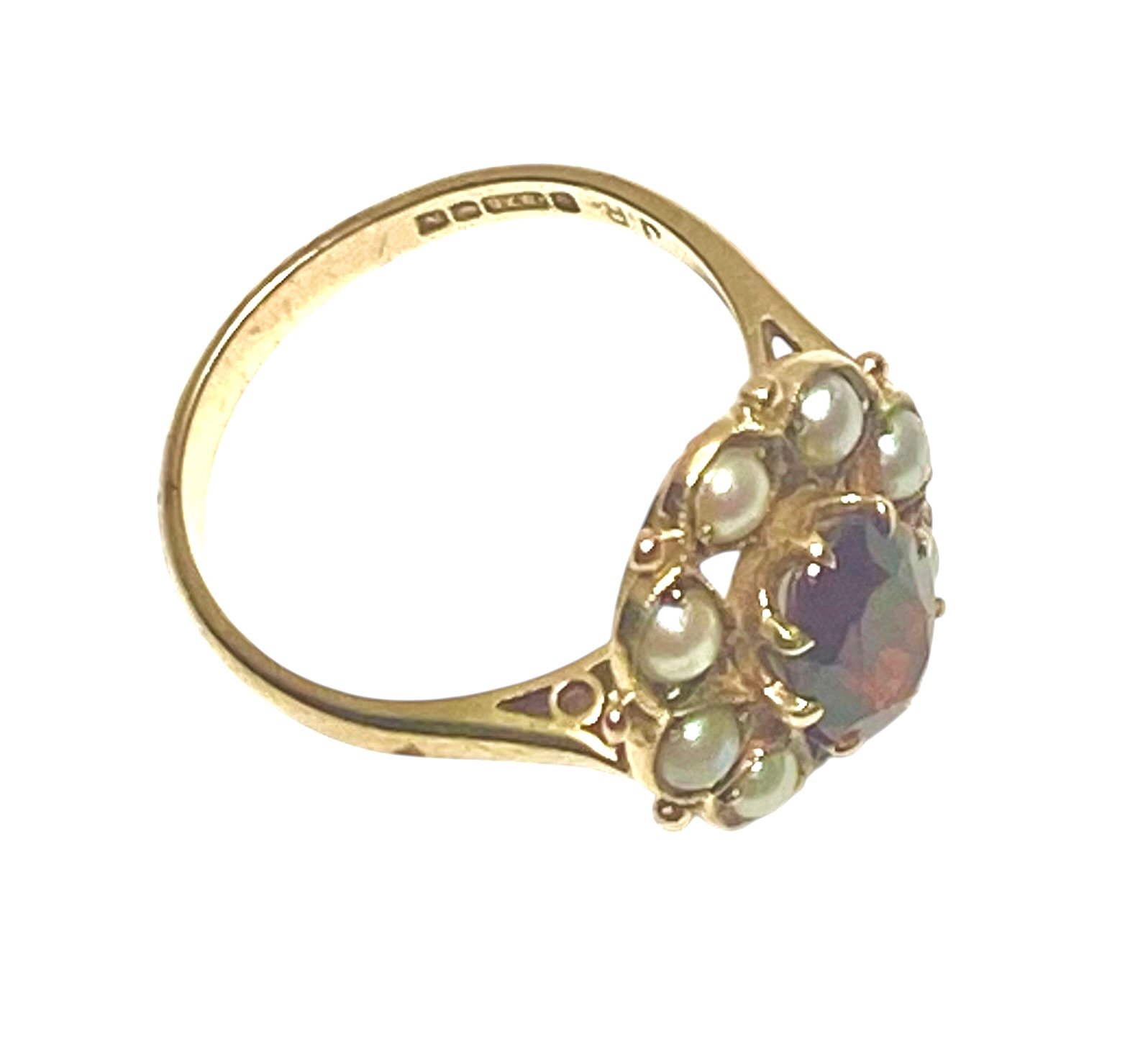 A very pretty and substantial 9ct gold ring in the Victorian style with a Garnett surrounded by seed pearls.