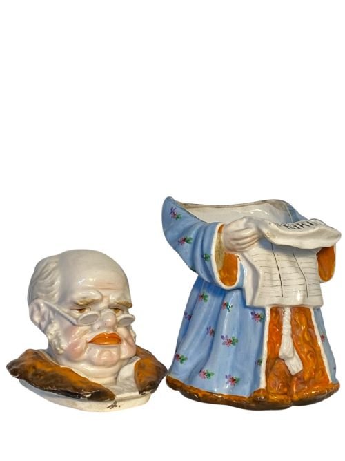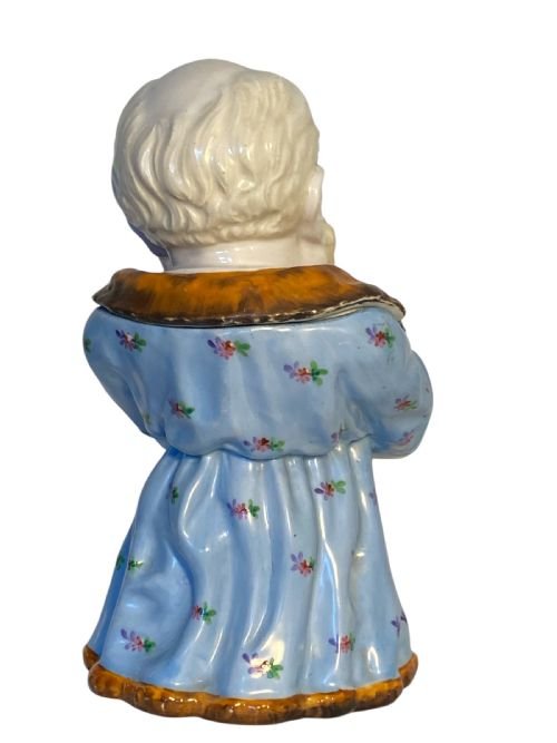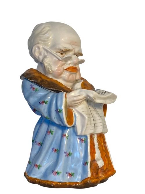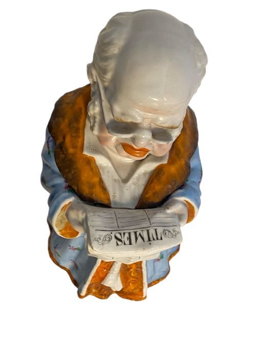 A large German porcelain tobacco jar in the form of an old man reading ‘The Times” newspaper.