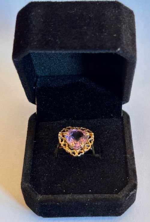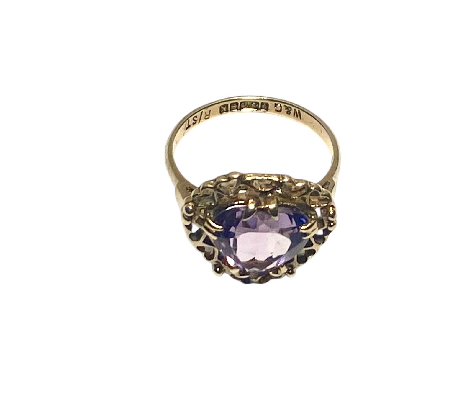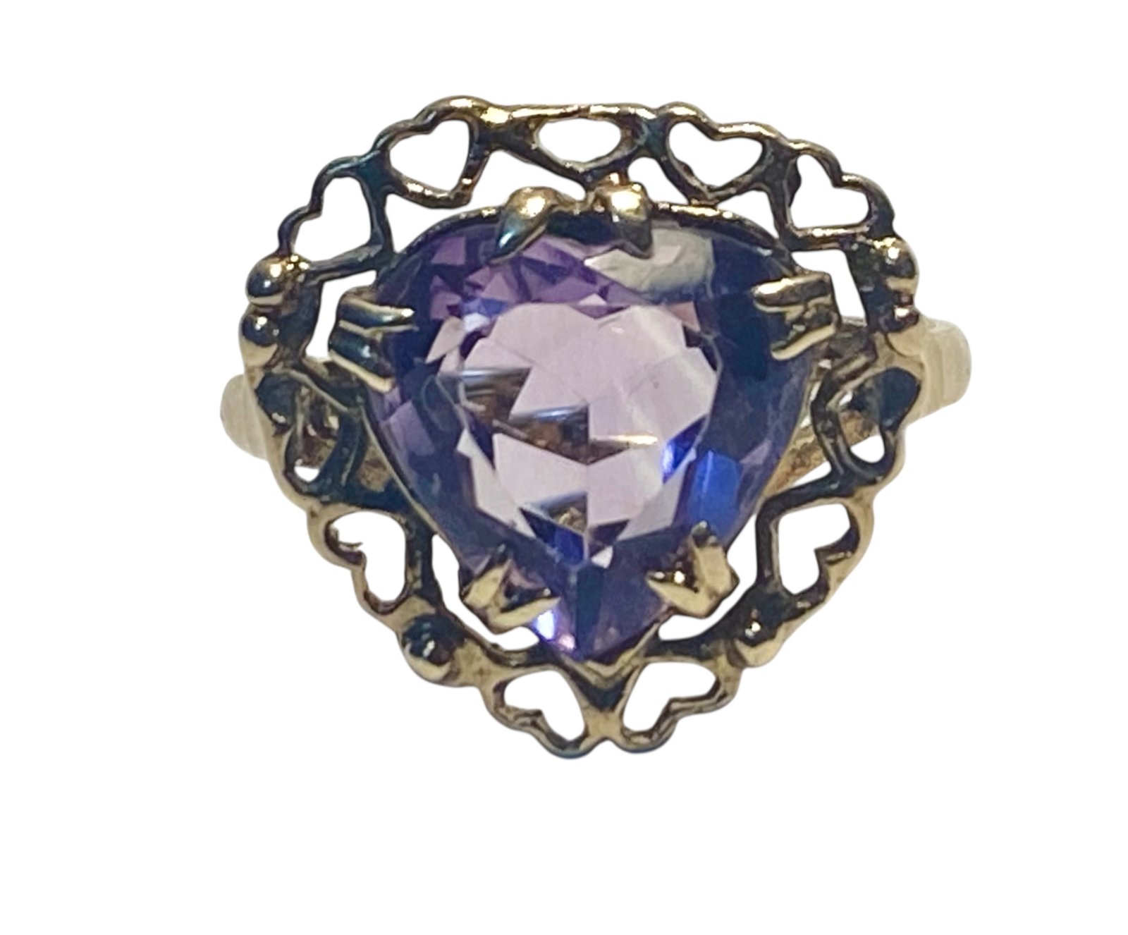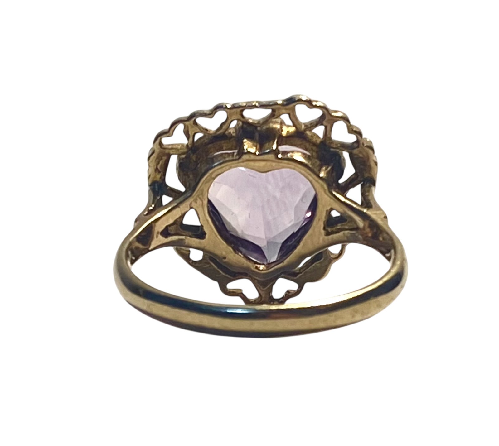 A very pretty amethyst heart cut ring set in an open work 9 carat gold setting.