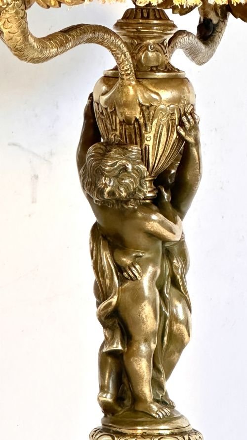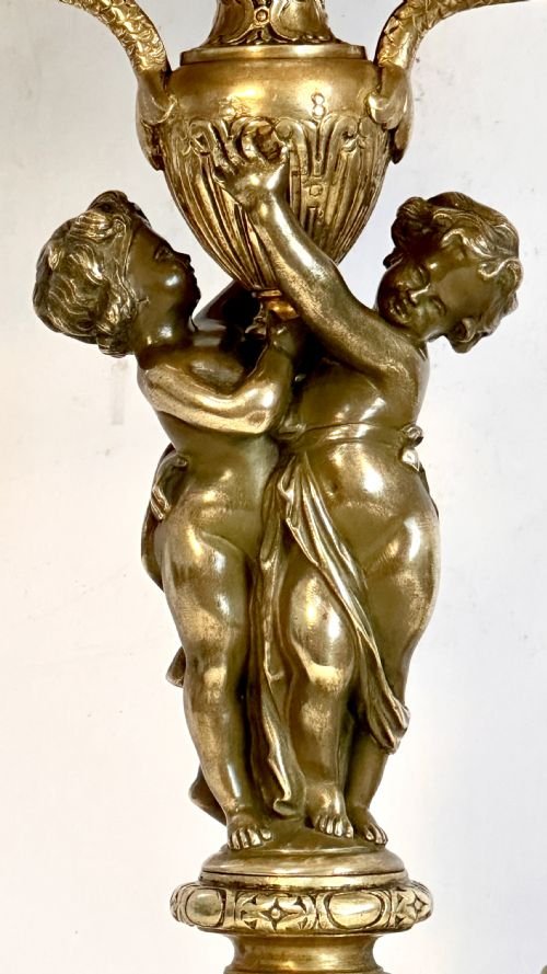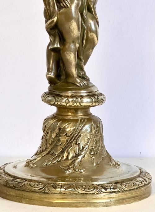 The column is made from gilt brass with carved foliage and a pair of bronze putti which give the appearance of supporting an urn.