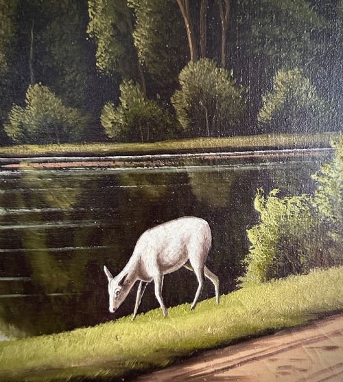 A large 19th Century Oil on canvas depicting a Spring countryside scene with trees and a lake with deer grazing.