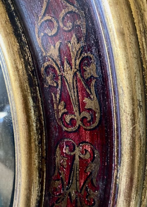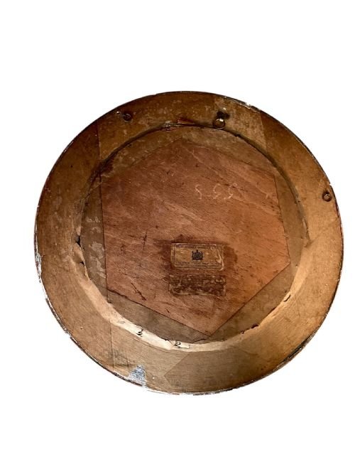 It is housed in a circular wooden frame which is painted in maroon with gilded borders and gilt stencil work.