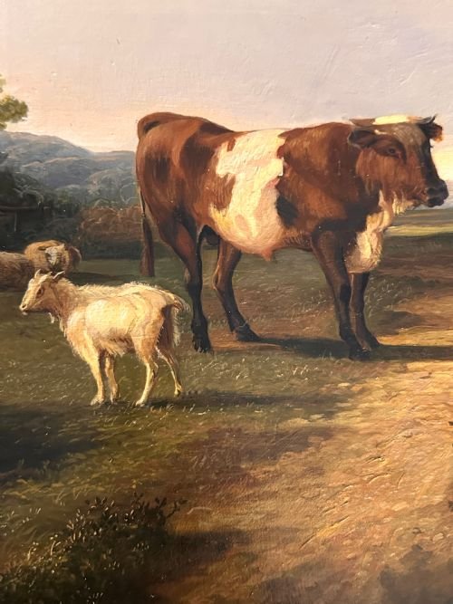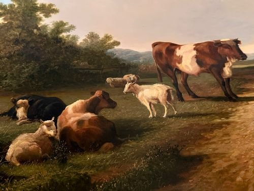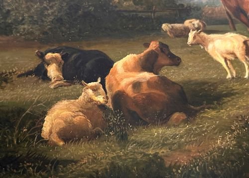 An oil on canvas by 20th Century artist Andre de Moller depicting cattle and sheep in a country setting.