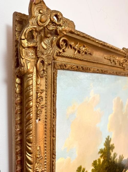 It is framed in a classical, gilded and very ornate carved frame which enhances the painting.