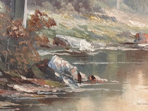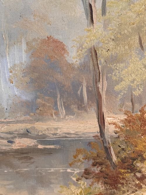 A lovely oil painting on canvas which depicts a wooded area on the banks of a winding river.