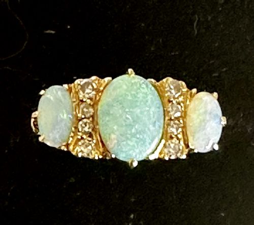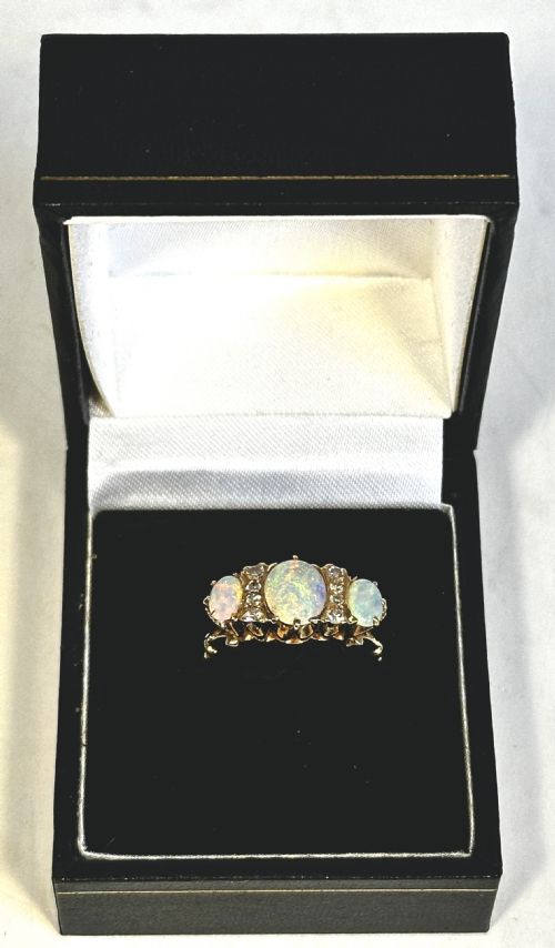 A very attractive opal and diamond dress ring with three graduated oval open cabochons (total weight estimated at 08 carats) interspersed with 2 rows of four single cut diamonds.