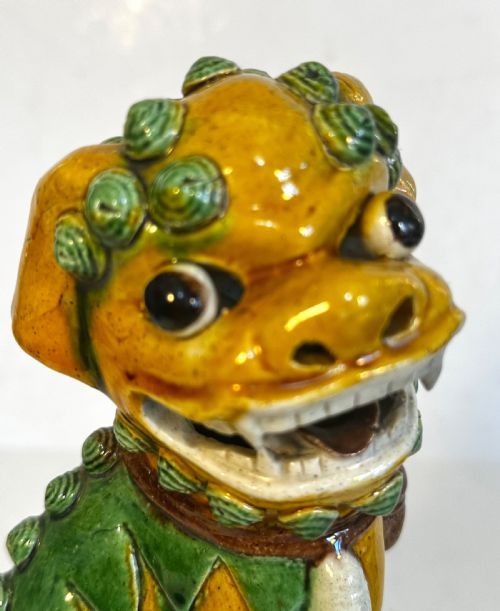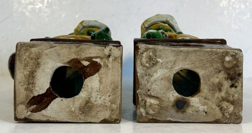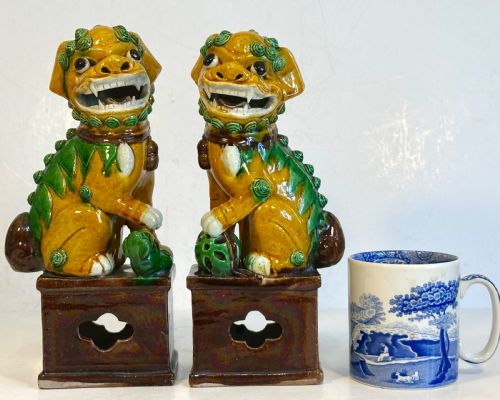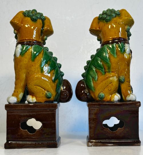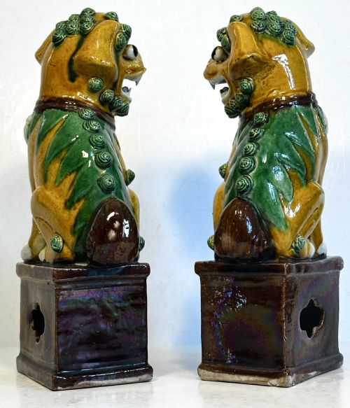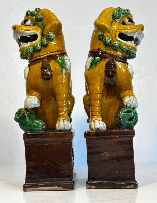 A pair of Chinese biscuit famille verte Buddhist lions.