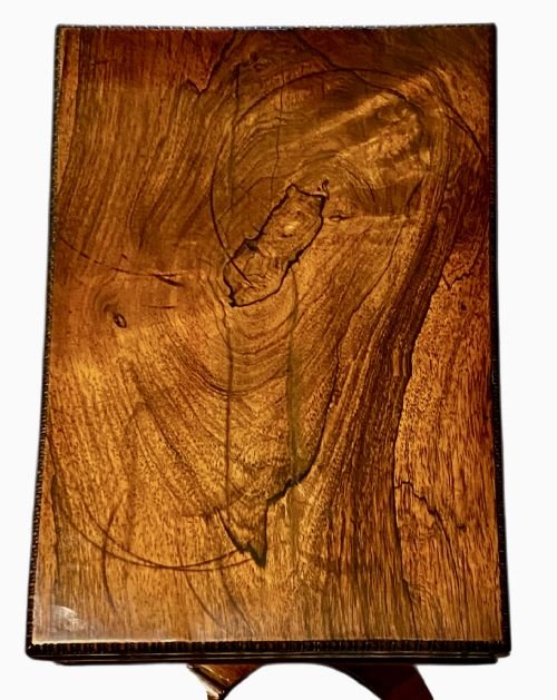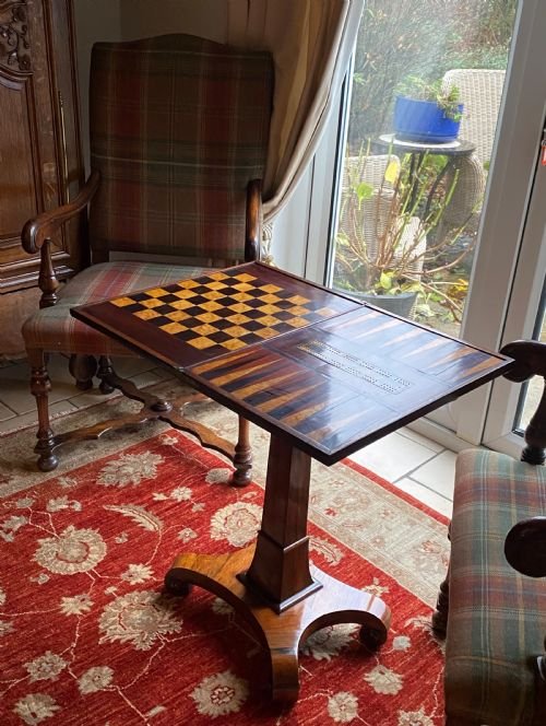 When opened, the hinged top swivels on the base to form a games table for chess, backgammon, draughts and cribbage.