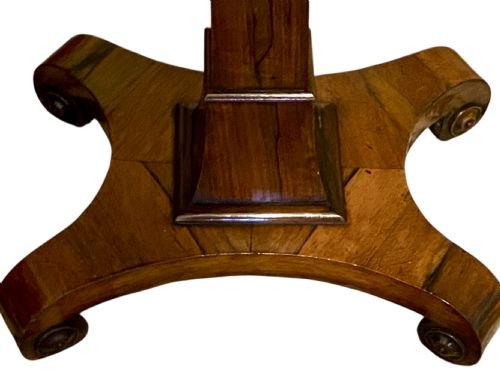 The top is inlaid with burr walnut, rosewood and ebony and is supported on a square pillar which culminates on four scrolled feet.
