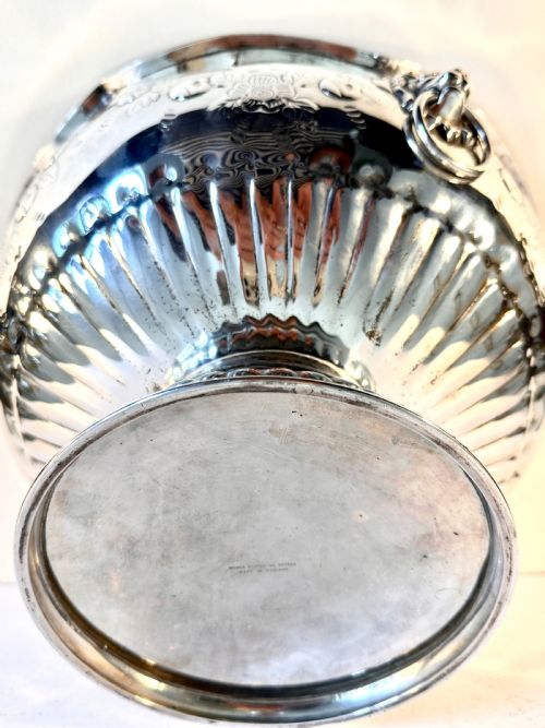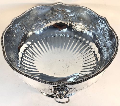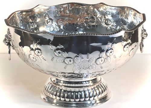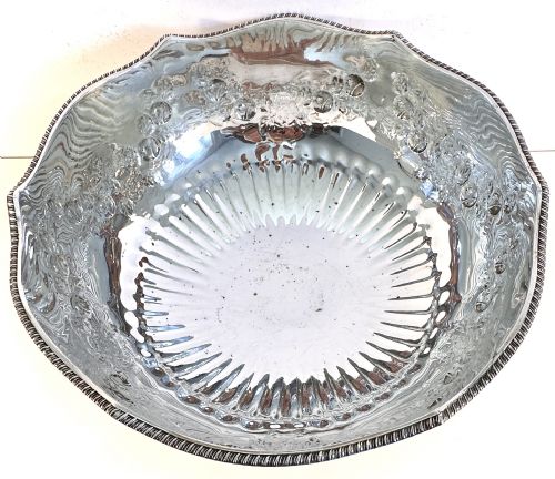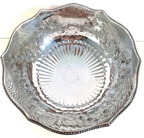 An attractive silver plated punch bowl with pressed grape and foliage decoration and wavy gadrooned edges.