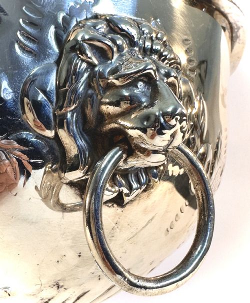 A pair of lions with ring handles grace the sides with the whole culminating on a gadrooned base with marks verso.