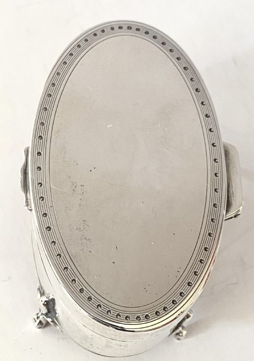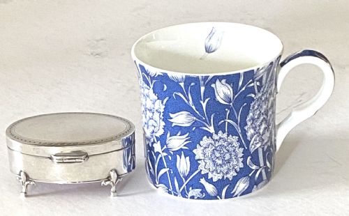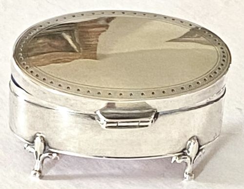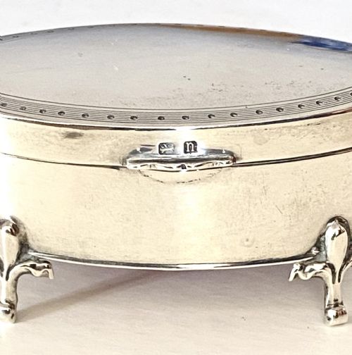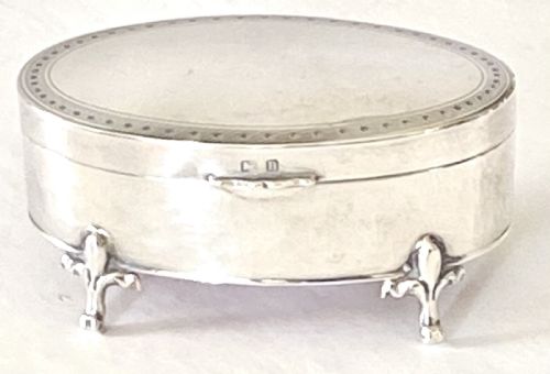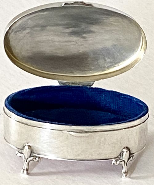 A beautiful and heavy silver trinket box with a blue velvet lining.