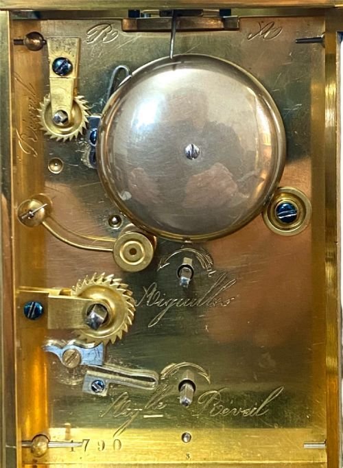 Backplate adjustment arbours are stamped “Aiguilles” (Hands) and “Aig le Reveil” (Alarm Hand), numbered 1790.